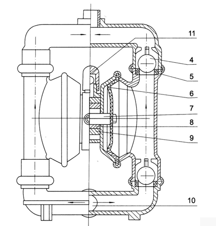 1 進(jìn)氣口 2 配氣閥體 3 配氣閥 4 圓球 5 球座 6 隔膜 7 連桿 8 連桿銅套 9 中間支架 10 泵進(jìn)口 11 排氣口