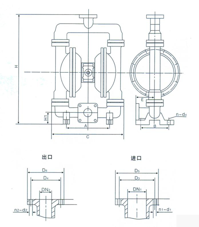 型號(hào) | A | B | D5 | D6 | C | H | H1 | DN1 | DN2 | n-d1 | n-d2 | D3 | D4 | E | n-d4 |